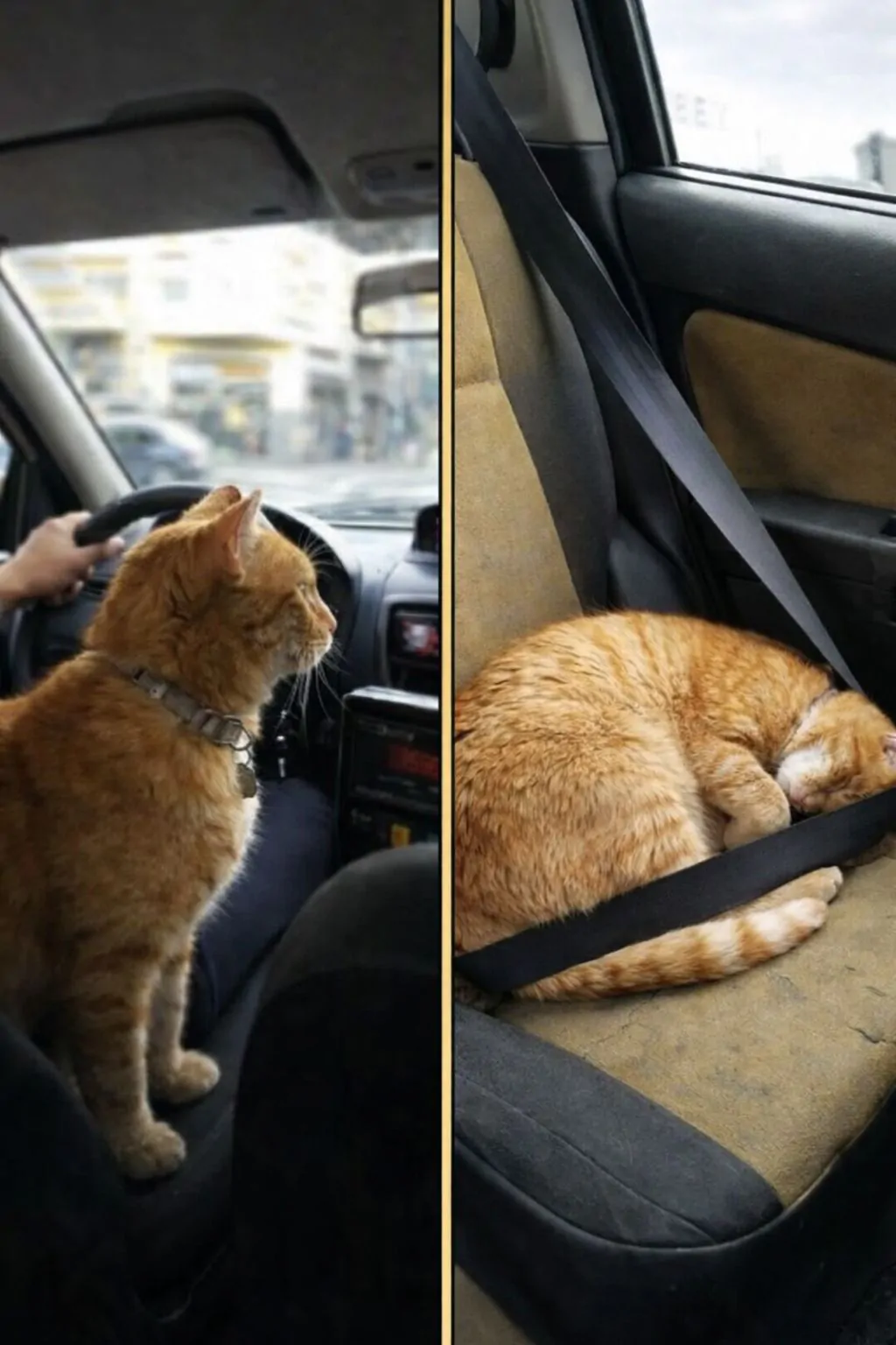 Accanto al conducente, seduto sul sedile del passeggero con la cintura di sicurezza allacciata, c’è quasi sempre un gatto arancione dal pelo folto e dall’aspetto piuttosto rotondetto.