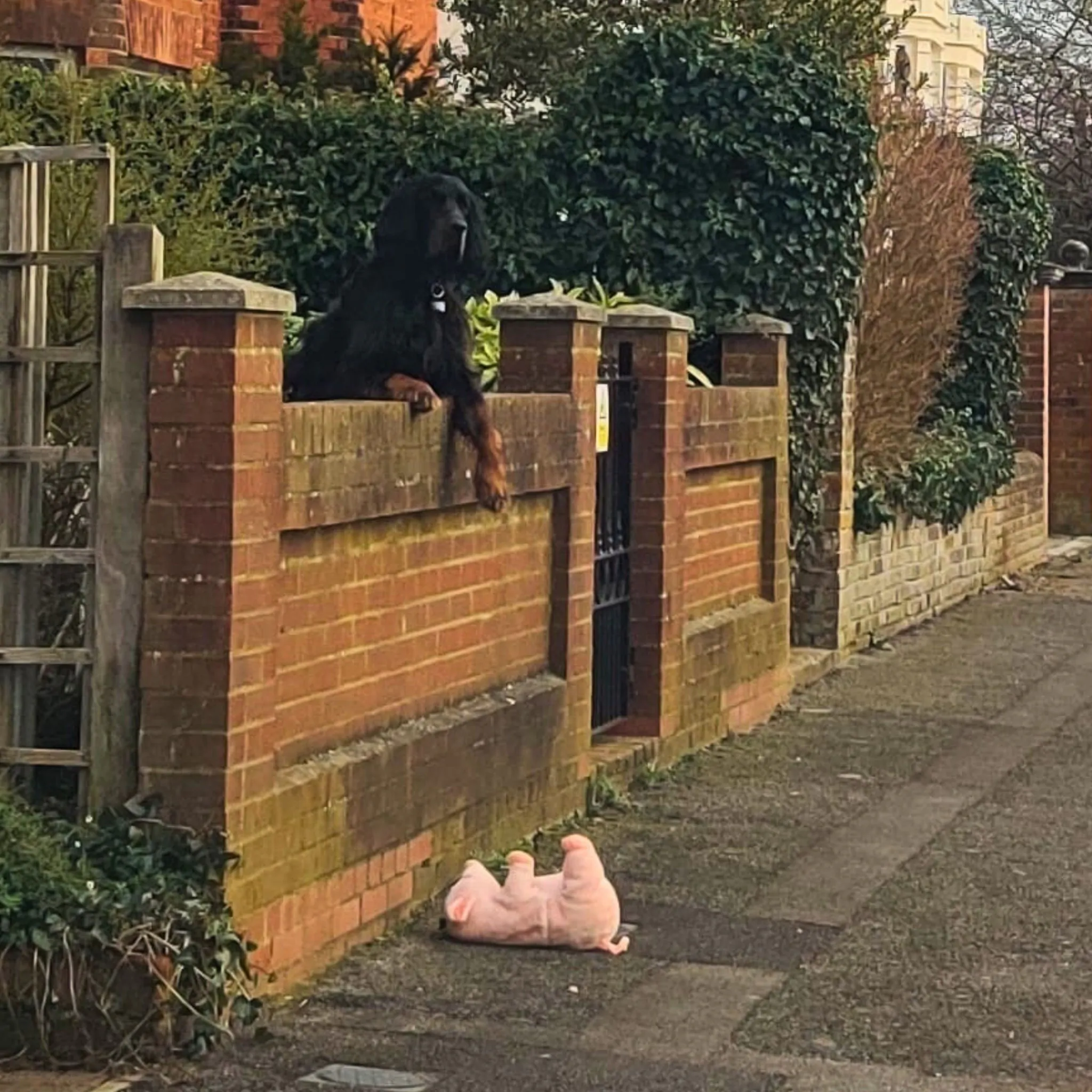 Ha raccolto il piccolo maialino di peluche dal marciapiede e lo ha sollevato verso il cane.