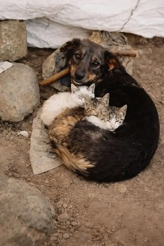 Il cane non mostrava aggressività. Al contrario, restava fermo accanto ai gattini, come se il suo unico compito fosse mantenerli al caldo.