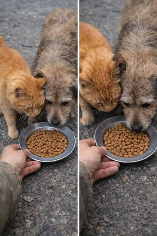 Quando i due animali raggiunsero la ciotola con il cibo, accadde un gesto che colpì profondamente Maria.