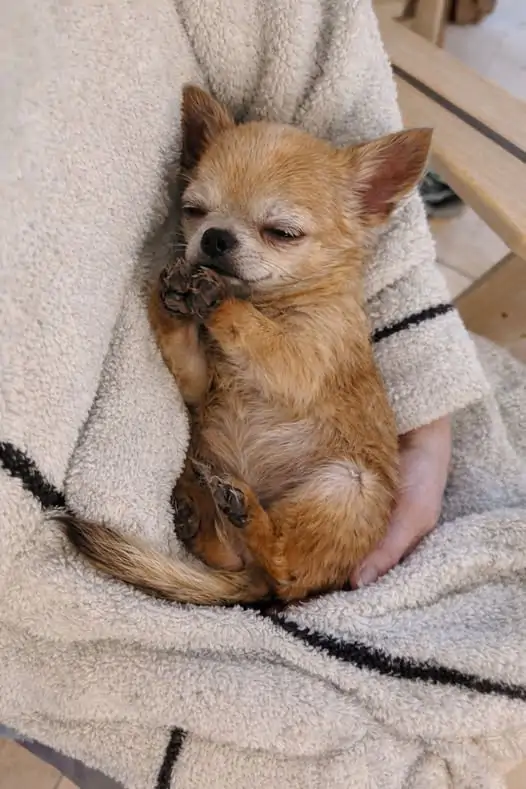 La piccola Chihuahua trascorre gran parte del tempo accanto alla donna che l’ha trovata. Si sistema sulle ginocchia oppure si addormenta vicino a lei.