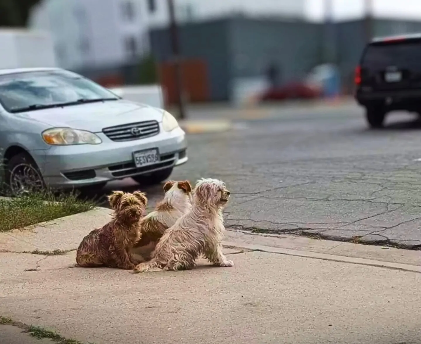 Seduti uno accanto all’altro, tre piccoli cani sono rimasti per ore sul bordo di una strada polverosa, fissando lo stesso punto all’orizzonte. Era la direzione da cui era scomparsa l’auto che li aveva lasciati lì.
