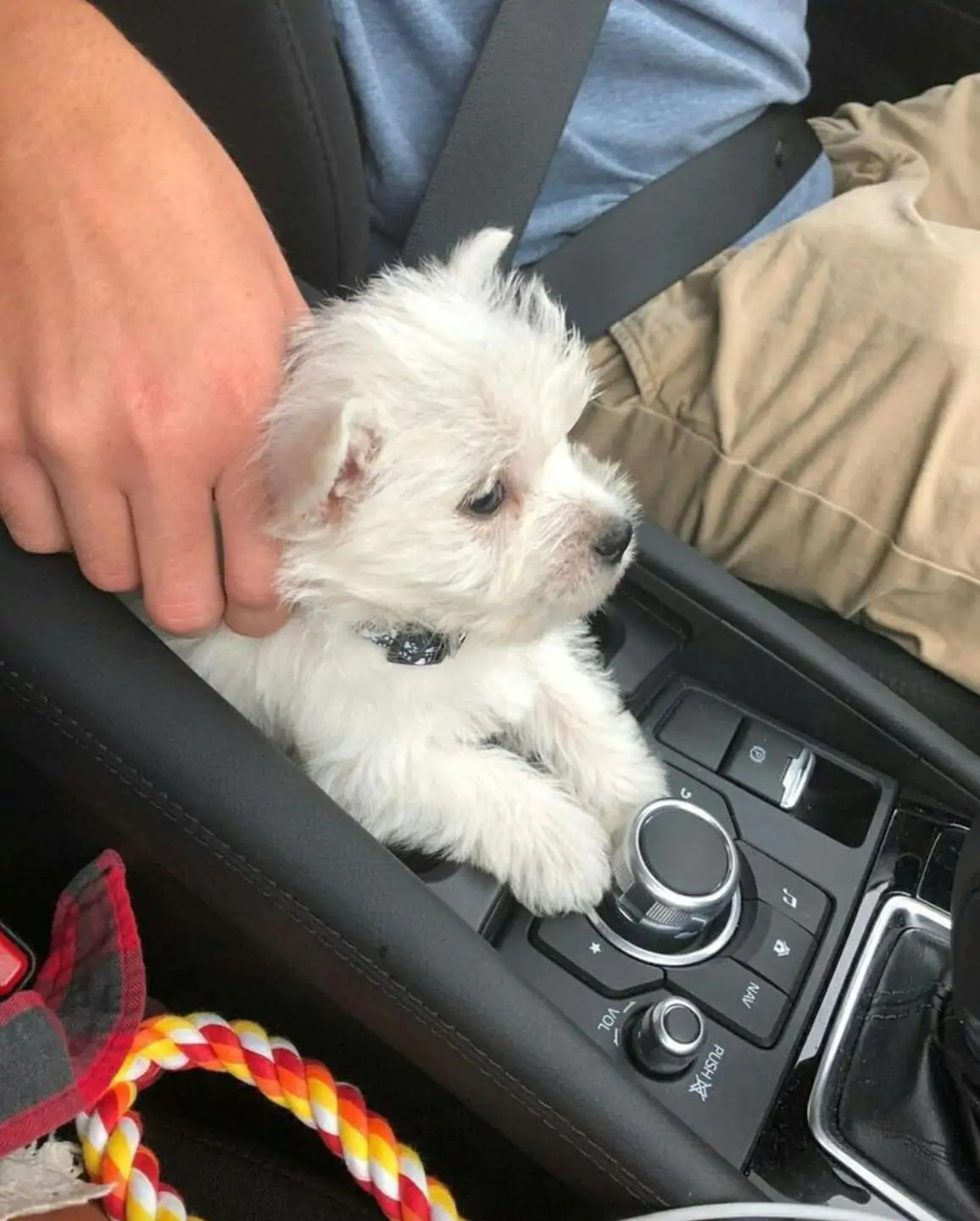 Il cucciolo si è accoccolato vicino alla console centrale, appoggiando le zampine come se quel posto gli fosse sempre appartenuto.