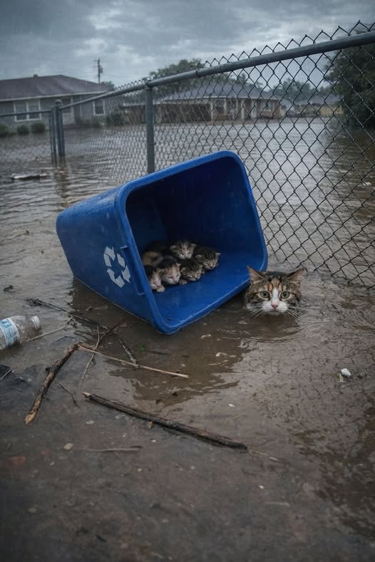 Una gatta randagia salva i suoi gattini durante un’alluvione: li mette su un contenitore galleggiante e resta nell’acqua gelida per ore per proteggerli.