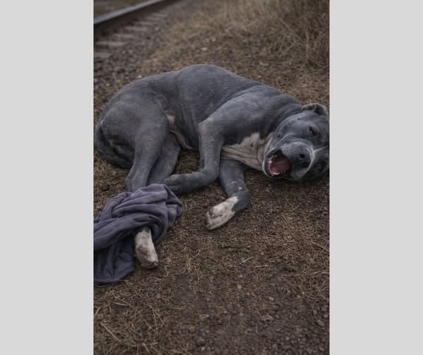 Era rannicchiata accanto a un tratto isolato di binari ferroviari, in un punto dove nessun animale dovrebbe mai trovarsi. Rosie, una pitbull dal mantello grigio-blu, giaceva tra erba secca e terra, immobilizzata dal dolore. Una delle zampe posteriori era rimasta impigliata in un pezzo di stoffa, e ogni minimo movimento le provocava sofferenze evidenti.
