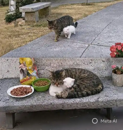 Il comportamento osservato non si limita alla semplice presenza. Il gatto adulto utilizza il corpo per indicare la direzione, accompagna il piccolo verso le ciotole e resta vicino nei momenti di maggiore vulnerabilità. Una dinamica che si ripete ogni giorno, diventando parte della routine del parco.