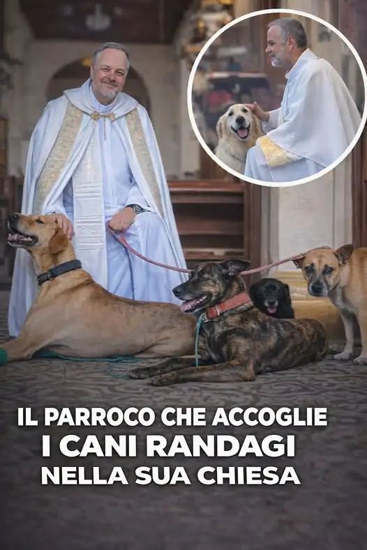 In una chiesa, cani randagi partecipano alla messa grazie al parroco che li cura e li presenta ai fedeli per favorirne l’adozione.