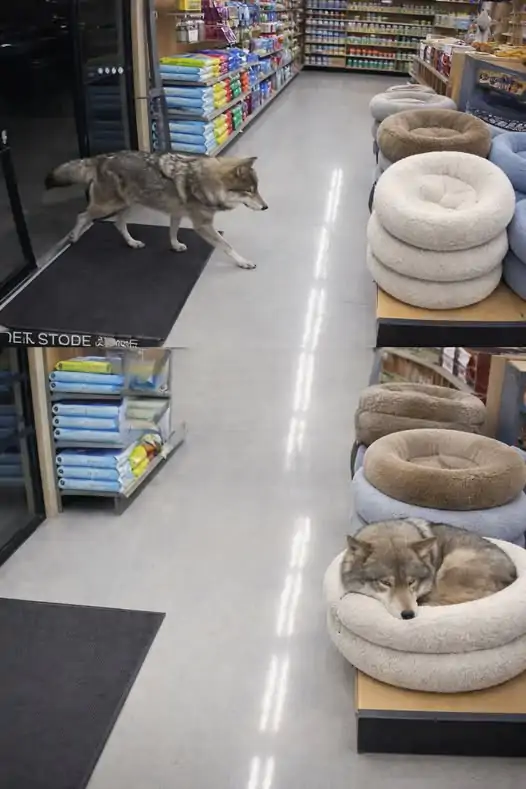 Durante una notte apparentemente ordinaria, una guardia di sicurezza ha notato un movimento insolito all’ingresso di un negozio di animali. In un primo momento, la sagoma sembrava quella di un grande cane, simile a un husky, entrato forse per caso.