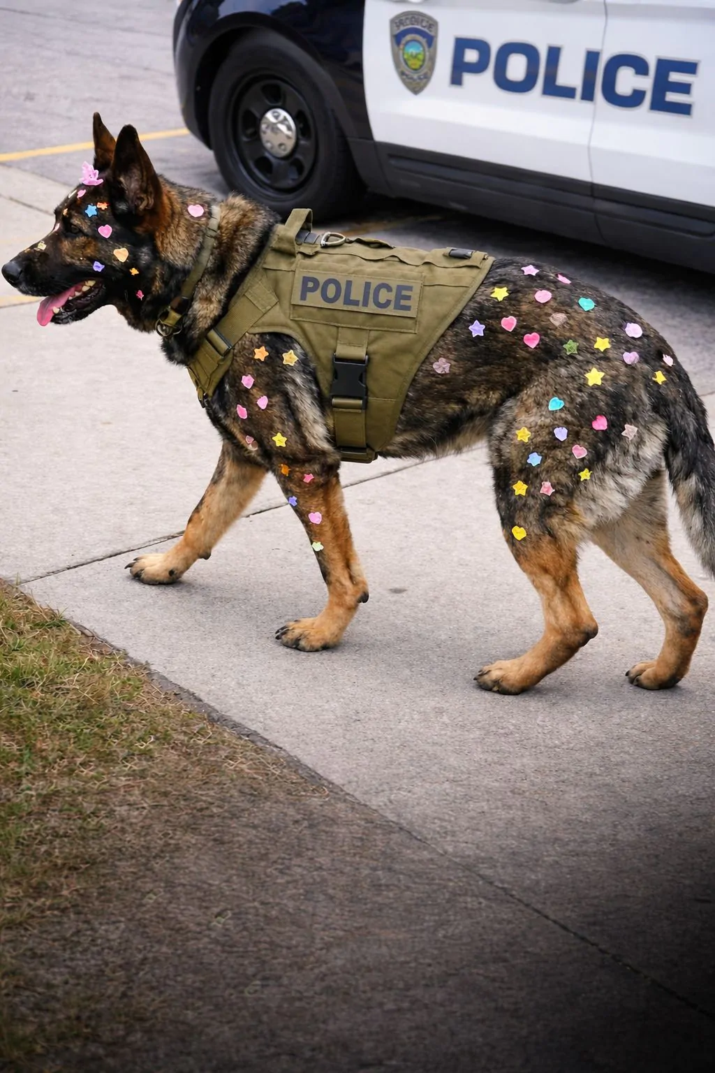 È in quel momento che la situazione ha preso una piega diversa rispetto alle aspettative. Invece di limitarsi a osservare o accarezzare il cane, i piccoli hanno iniziato a decorarlo. Adesivi colorati, stelline e cuoricini sono comparsi sul suo pelo e sul giubbotto, senza che Blaze opponesse alcuna resistenza.