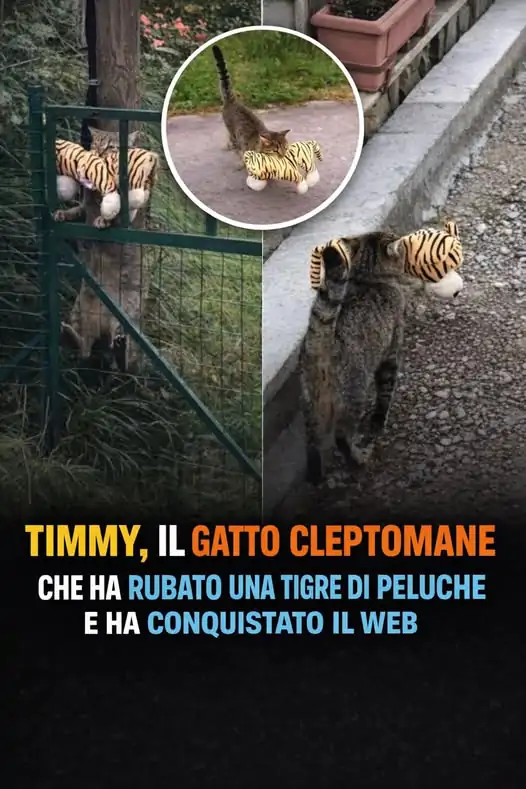 Un gatto ruba una tigre di peluche dal giardino vicino e, con determinazione, riesce a superare una recinzione trascinandola fino alla sua casa.