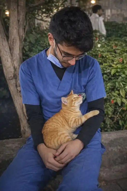 Un piccolo gattino randagio si è avvicinato lentamente, senza fare rumore. Non mostrava timore né esitazione, come se avesse percepito qualcosa. Si è fermato davanti al giovane infermiere, lo ha osservato per qualche secondo, poi ha compiuto un gesto semplice ma significativo.