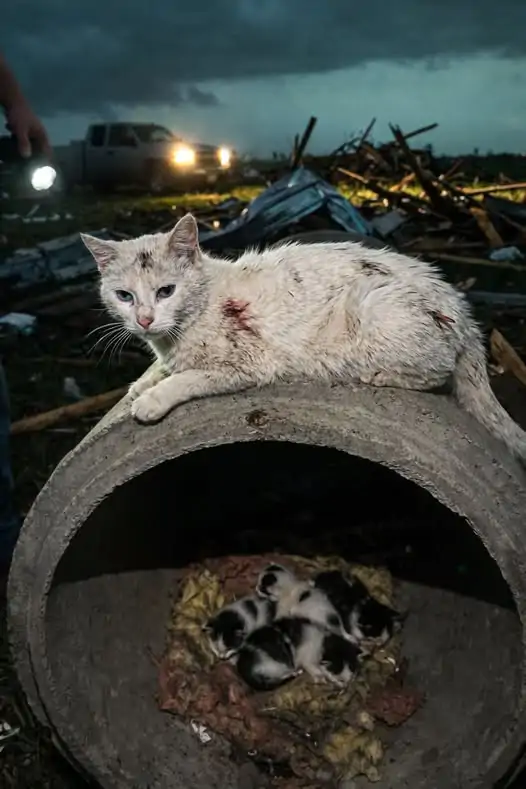 Gatta sorda percepisce il tornado, sposta i suoi piccoli in un rifugio e li protegge mentre la tempesta distrugge tutto intorno