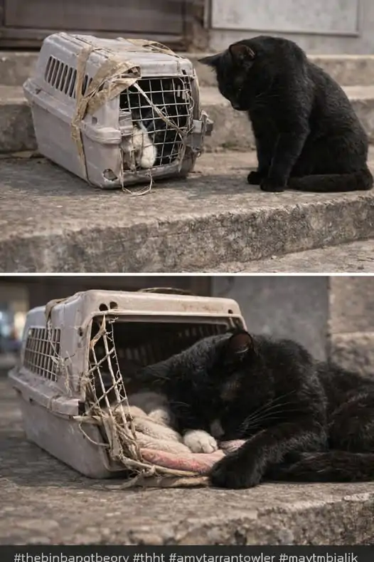 Guerrero gatto nero resta davanti a una clinica chiusa accanto a una trasportina con un piccolo dentro, in attesa di qualcuno che non torna