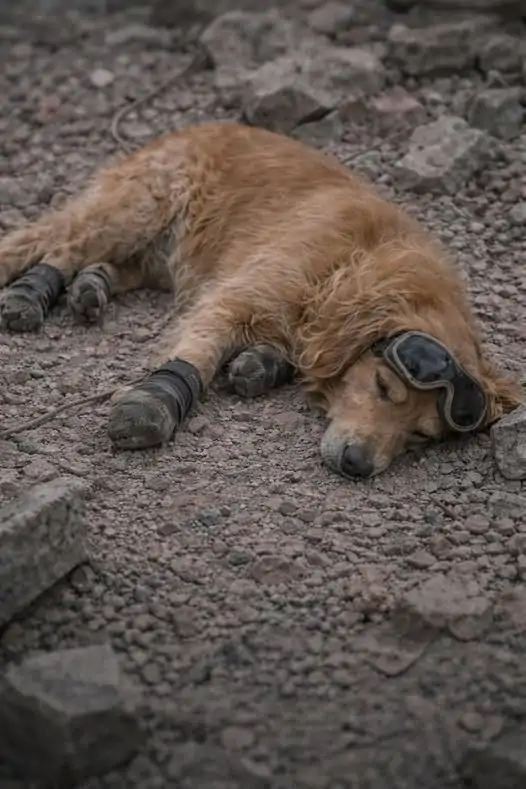 Cane soccorritore salva tre persone tra le macerie, lavora per ore senza sosta e alla fine si accascia sfinito dopo aver completato la sua missione.