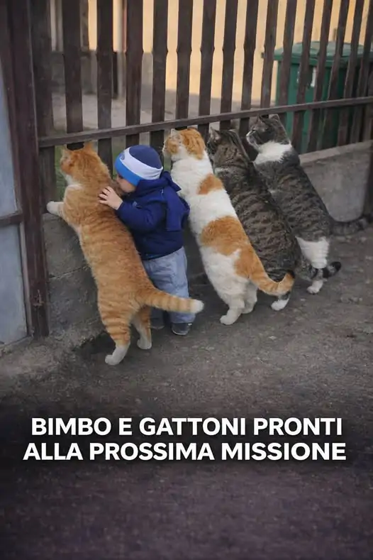 Il bambino non mostra timore e i felini non manifestano aggressività, creando una situazione che appare quasi sospesa nel tempo.