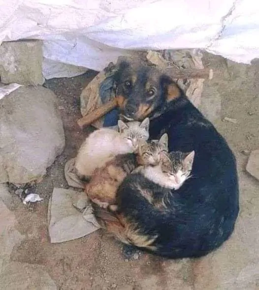 “Un cane randagio, in silenzio, accoccolava tra le sue zampe tre gattini, proteggendoli dal freddo con il proprio corpo.”
