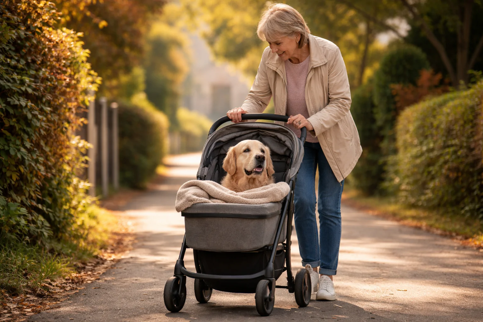 Una dolce passeggiata quotidiana diventa simbolo di amore: una donna accompagna il suo cane nel passeggino, trasformando la passeggiata in un gesto profondo e costante.