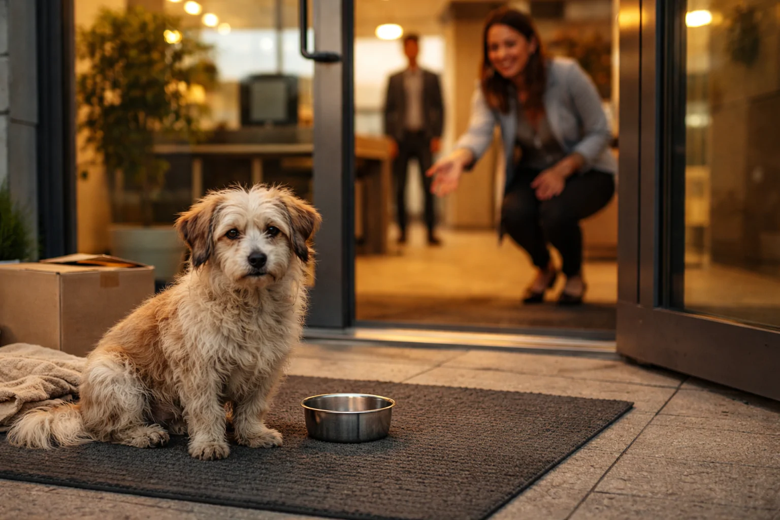 Un cagnolino randagio trova rifugio davanti a un ufficio, conquista tutti e trasforma la sua vita grazie all’affetto e alla protezione ricevuta ogni giorno.