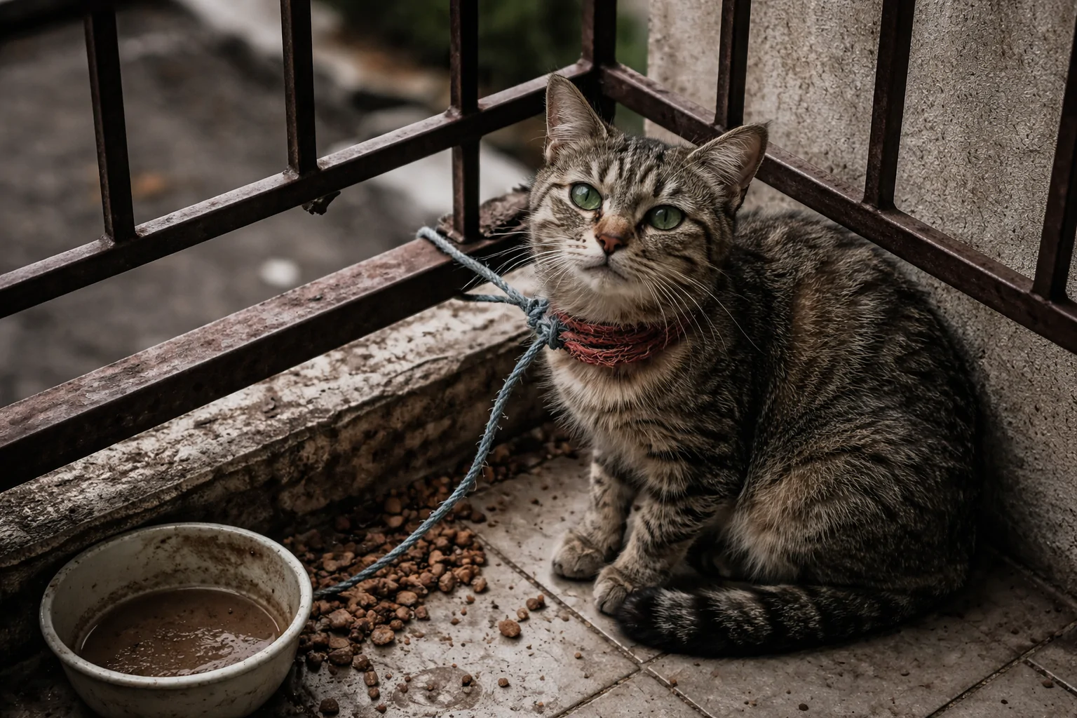 Una gatta tigrata era legata alla ringhiera con una corda estremamente corta, che limitava quasi completamente i movimenti. Non c’erano ciotole d’acqua né tracce di cibo, e nessuna protezione contro il sole o le intemperie. L’animale appariva debilitato ma ancora vigile, continuando a emettere deboli miagolii.