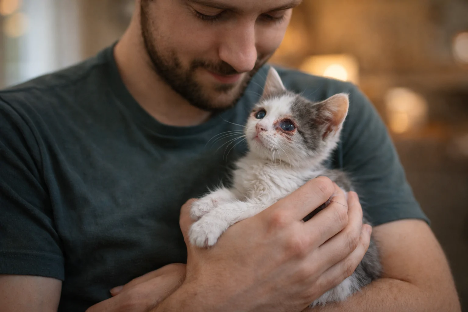Un gattino fragile e ignorato trova salvezza grazie a Marco: cure, casa e affetto gli permettono di crescere e superare una condizione iniziale critica.