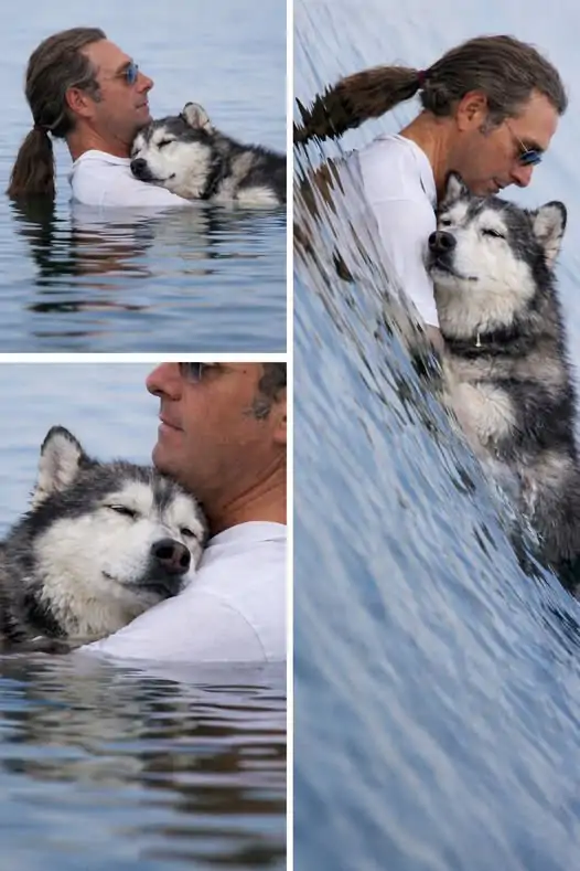 Un uomo aiuta ogni giorno Shep, Husky anziano con artrite, portandolo nel lago per alleviare il dolore e permettergli finalmente di dormire serenamente.