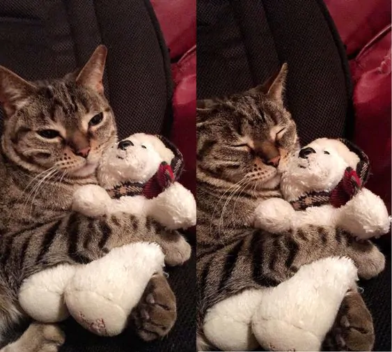 L’immagine del gatto con il suo orsetto richiama gli stessi gesti di quando era cucciolo, come se nulla fosse cambiato.