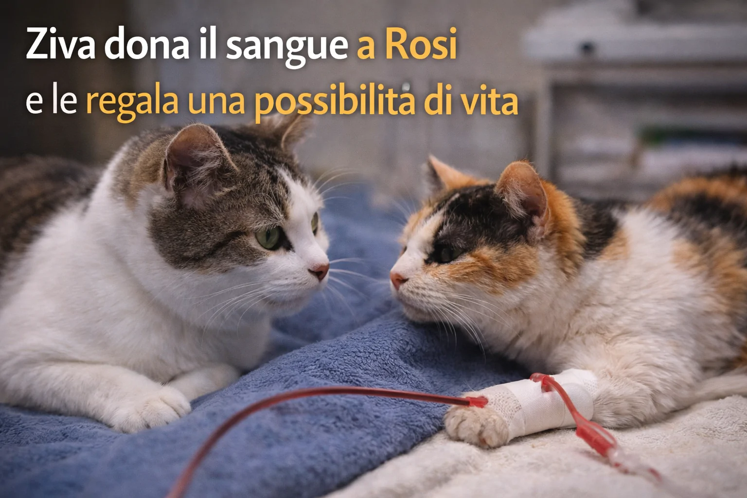 Ziva, giovane gattina, dona il sangue per aiutare Rosi in condizioni critiche, grazie all’intervento tempestivo di Alessia e al supporto dell’associazione che segue il caso.