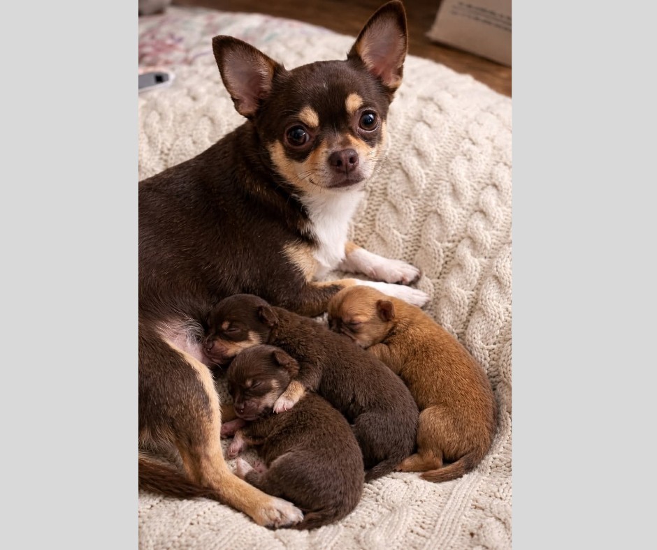 Sono nati tre cuccioli di Chihuahua, estremamente piccoli, ciascuno non più grande del palmo di una mano.