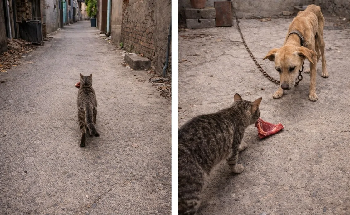 Un gatto si avvicina a un cane denutrito e gli porta del cibo. Non scappa, resta accanto a lui mentre mangia. Una scena che racconta un legame inatteso.
