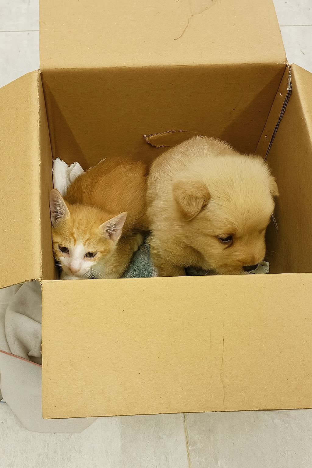 Due animali indifesi sono stati lasciati all’interno di una scatola di cartone completamente chiusa con nastro adesivo.