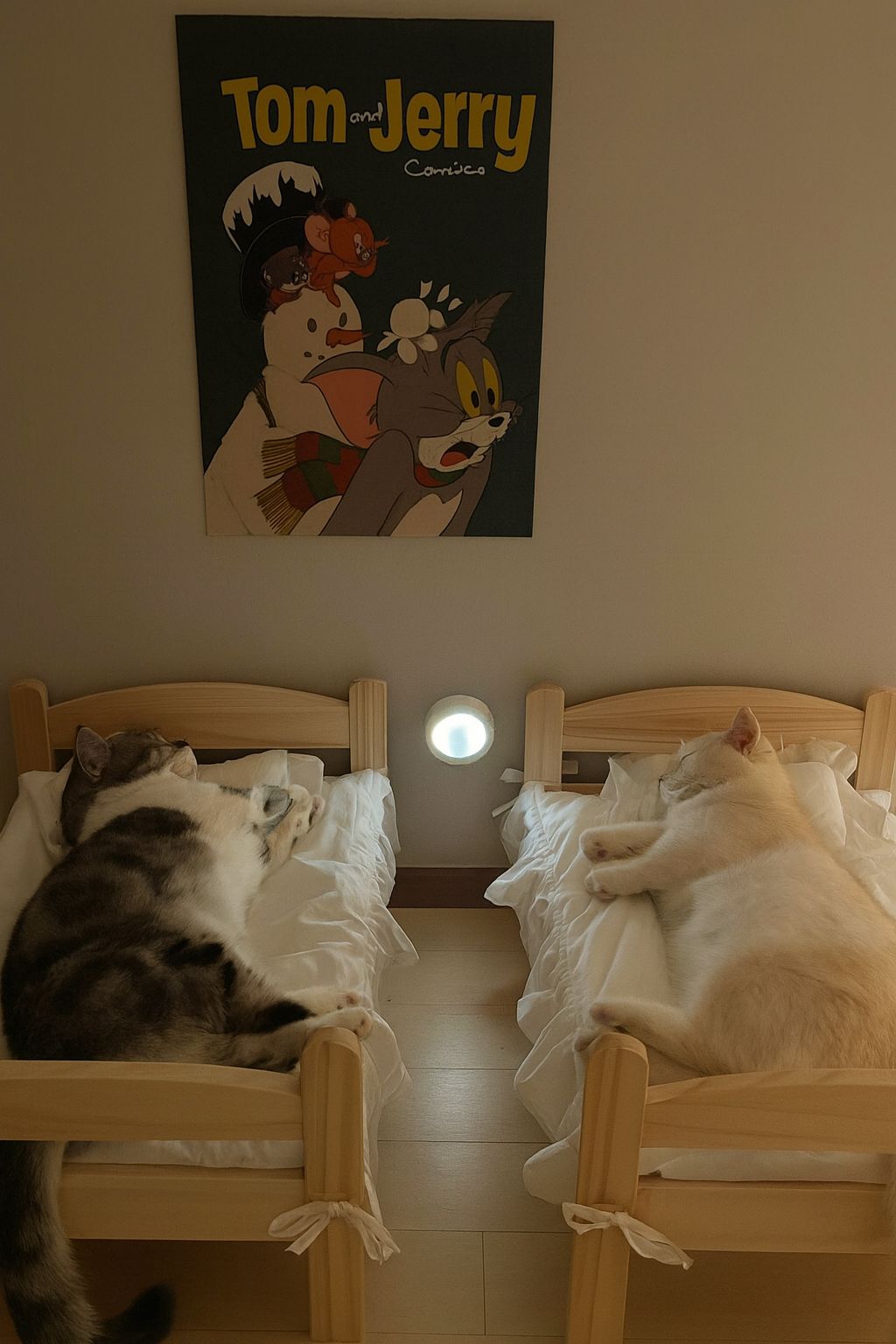 Due gatti randagi entrati in casa senza particolari progetti, sistemati con ciò che era disponibile.