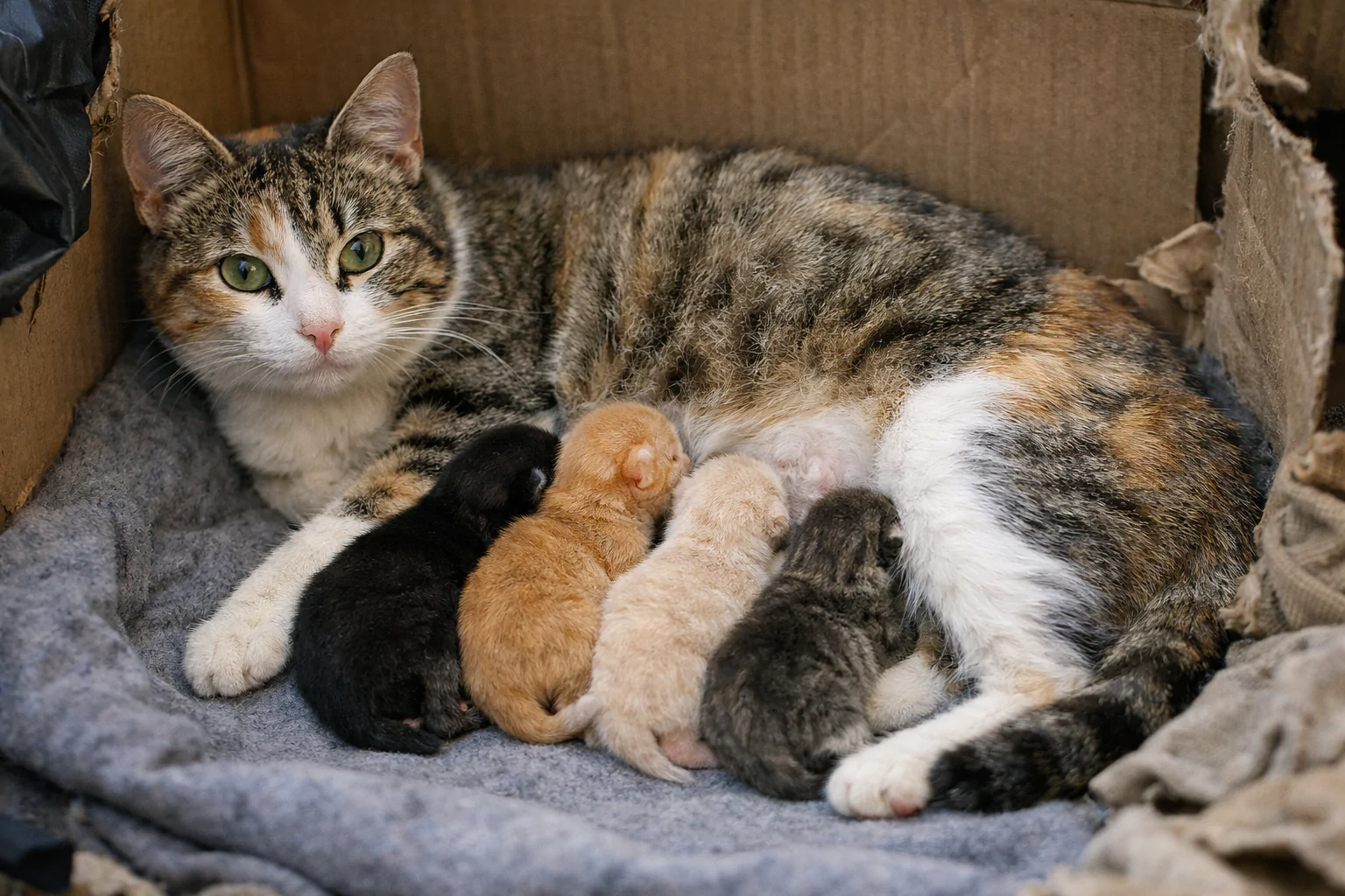 Gli agenti hanno deciso di accoglierla all’interno della struttura, predisponendo uno spazio riparato. In questo ambiente, la gatta — successivamente ribattezzata Molang — ha partorito quattro gattini.