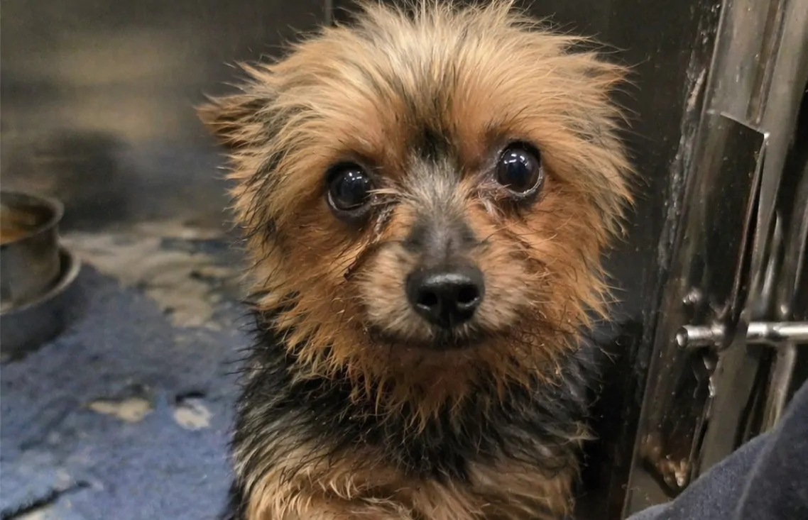 All’interno della struttura, l’attenzione viene attirata da un piccolo cane di razza yorkshire, descritto dal personale come “fragile”. L’animale si trovava in fondo a un box, in condizioni di evidente trascuratezza: pelo annodato, postura chiusa e scarsa reattività. Manteneva lo sguardo fisso su una coperta consumata, segno di un possibile legame precedente.