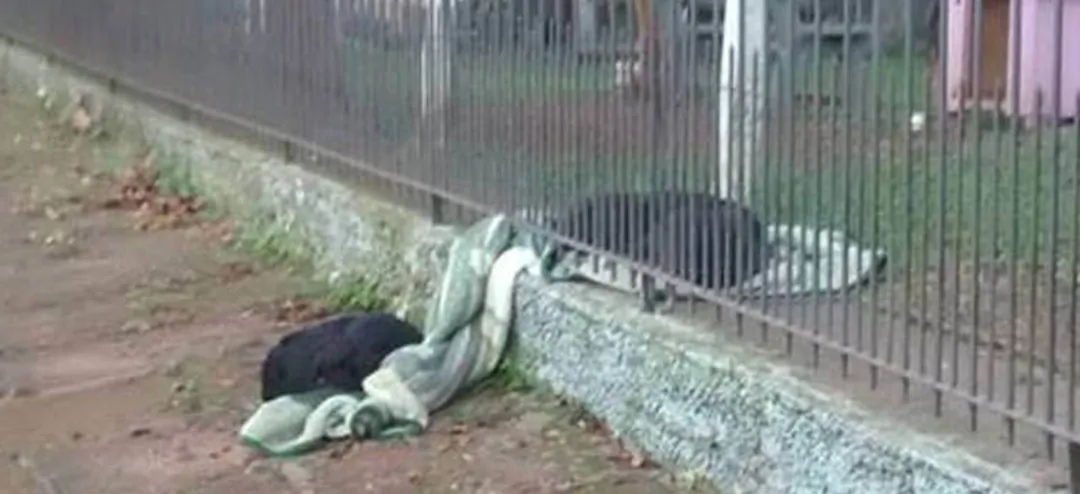 Una cucciola trascina fuori casa la propria coperta per offrirla a un cane randagio esposto…