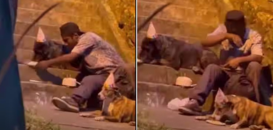 Un uomo senza dimora ha organizzato una piccola festa di compleanno per i suoi cani, con cappellini e torta, condividendo il momento seduto sul marciapiede.